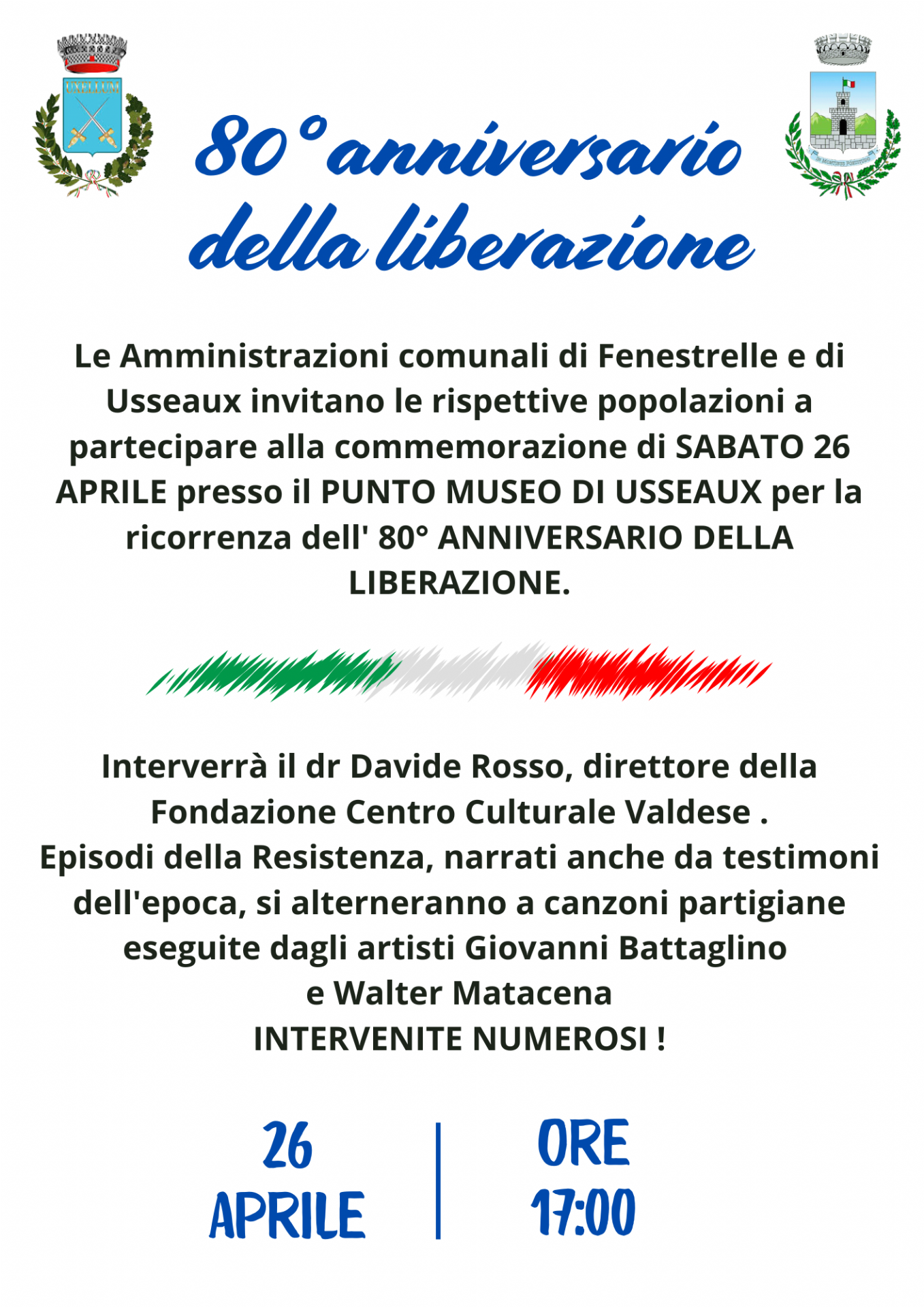The municipal administrations of Fenestrelle and Usseaux invite their respective populations to participate in the commemoration on Saturday 26 APRIL at the Brunetta Museum Point in Usseaux for the 80th ANNIVERSARY OF THE LIBERATION.