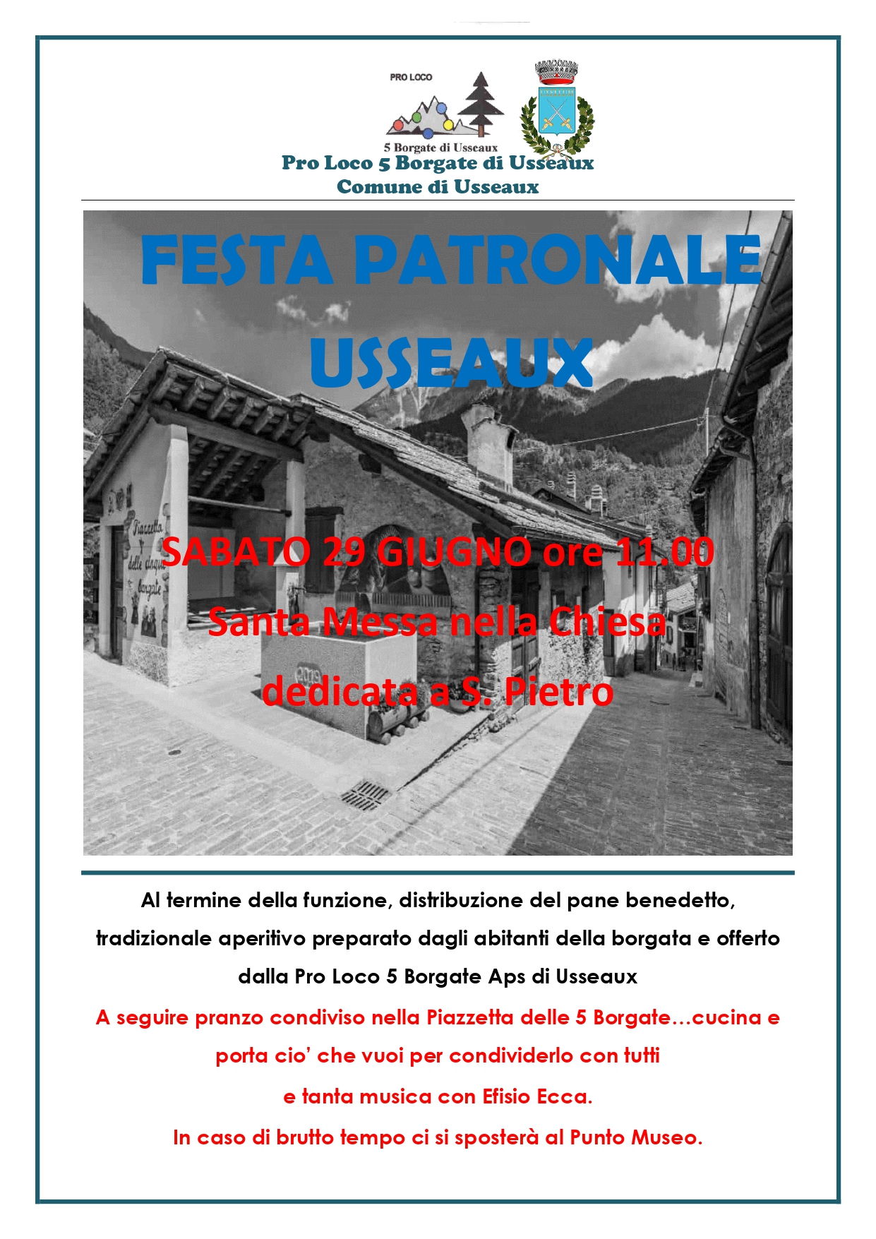 Al termine della funzione, distribuzione del pane benedetto, tradizionale aperitivo preparato dagli abitanti della borgata e offerto dalla Pro Loco 5 Borgate Aps di Usseaux