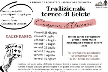Calendario tradizionale di Belote per l'estate 2024 da venerdì 28 giugno a venerdì 16 agosto, tutti i venerdì presso il Punto Museo Brunetta di Usseaux L'appuntamento è alle ore 21.00 Per...
